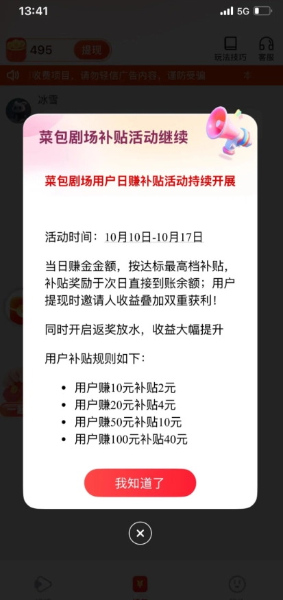 菜包剧场欢乐版也叫菜包剧场赚钱,是一款通过看广告获取收益的软件。如今连看广告都如此“内卷”了,这款软件的核心功能是免费观看短剧以及通过看广告积累金币。平台内的短剧资源无需多言,值得一提的是其金币机制:观看短剧时能拆红包,每日签到也可领取金币,新用户登录后还能享受专属的新人福利。