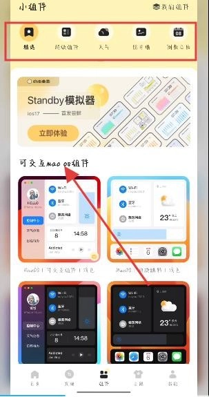 切换至小组件界面后,顶部设有精选、倒数组件等各类小组件分类板块,点击相应分类或下方的可交互小组件,即可按照指引体验或添加小组件。