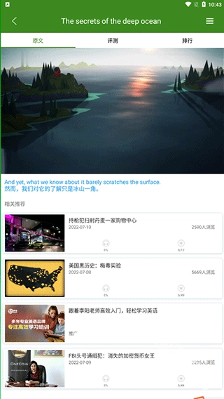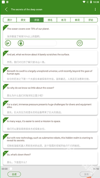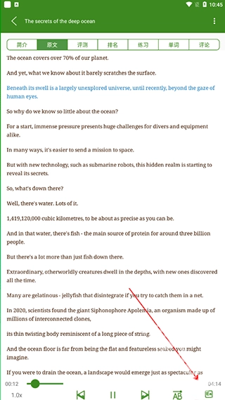 2、软件的强大就体现在这里了,可以在线播放原文,对照中英文理解文章意思,你也可以隐藏中文只显示英文