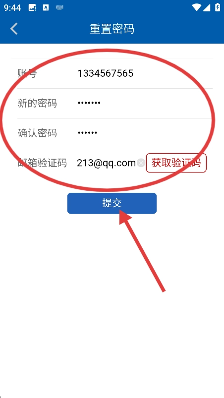 2、在重置密码页面,按照要求填写对应数据后,点击【提交】完成密码重置。