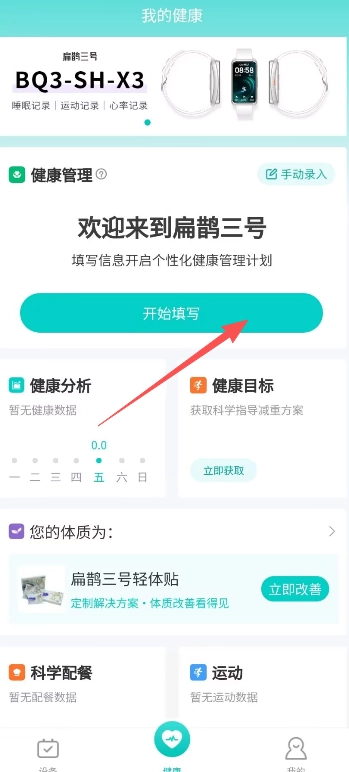 2、打开软件后,在健康管理界面点击“开始填写”按钮,就能开展后续的操作步骤了。