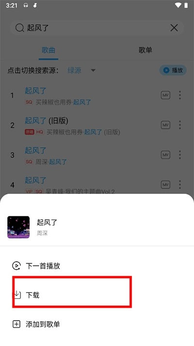 点击音乐右侧的更多按钮,选择音质后就能添加到队列。