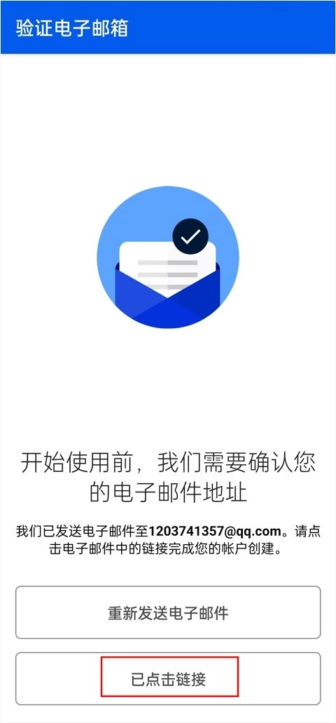4、填写完成并点击“下一步”后,会进入验证邮箱的页面,此时只需在QQ邮箱里点击该平台发送的链接即可。