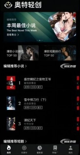 1、打开奥特轻创,在首页可以看到最近热门的小说。