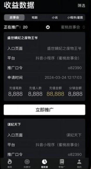 4、能够查看个人收益数据的详细信息,点击推广按钮有助于获取更优的数据表现。