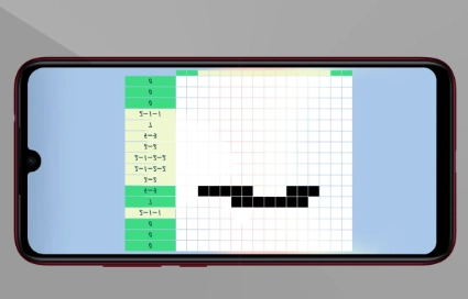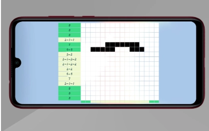 到了这个界面,是不是有点懵?其实很简单,只要让最左边和最下面的部分全都变成绿色,就能完成这个图案啦。你看,图里左边的数字代表这一行有多少个黑块,你只需要点击这一行对应的方块,一直点到整行都变成绿色就可以了。