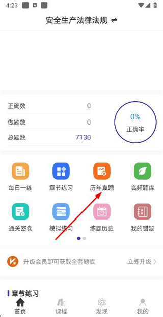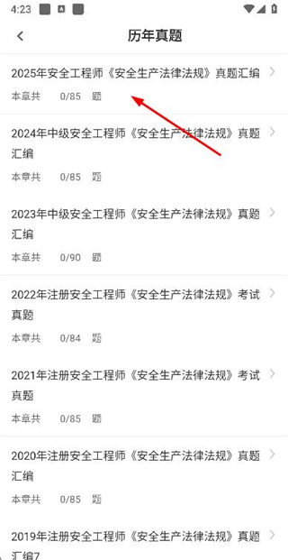 1、在安全生产法律法规页面中找到并点击“历年真题”选项,即可进入历年真题列表页面。
