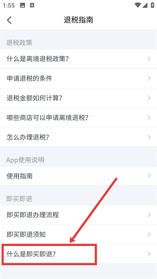 3、若想了解即买即退的详细说明,可在退税指南页面点击【什么是即买即退?】进行查看。