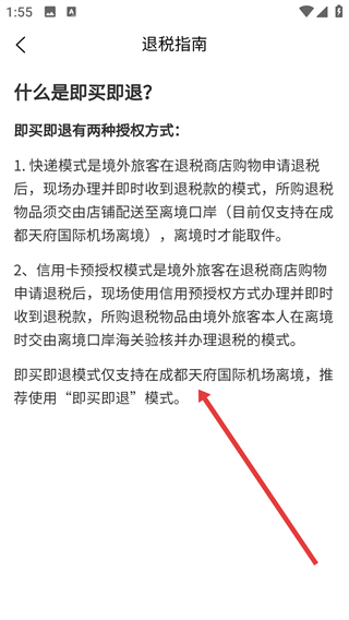 4、进入【什么是即买即退?】详情页面,能够了解到即买即退的两种授权方式以及适用的离境口岸等相关信息。