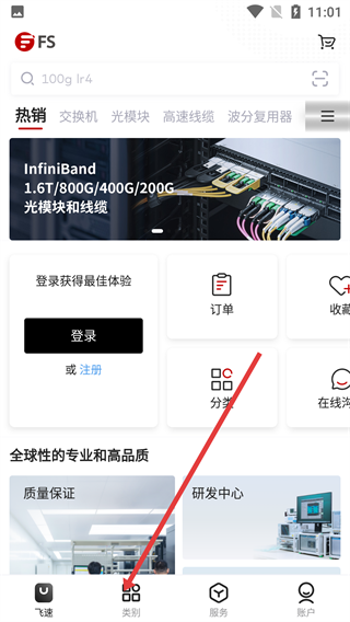 1、打开软件进入首页后,点击底部的【类别】按钮,就能进入产品分类页面,该页面包含交换机、光模块等各类产品的分类入口。