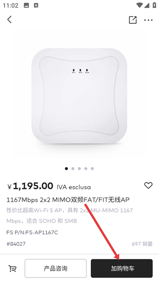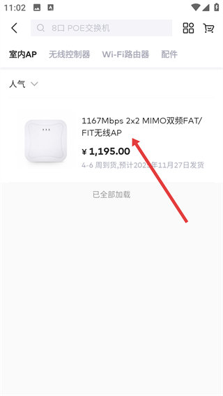 3、在室内AP的产品列表里,找到你感兴趣的产品(例如【1167Mbps-2x2-MIMO双频FAT/FIT无线AP】),在进入该产品的详情页面之前,就能看到它的价格、到货时间等相关信息。