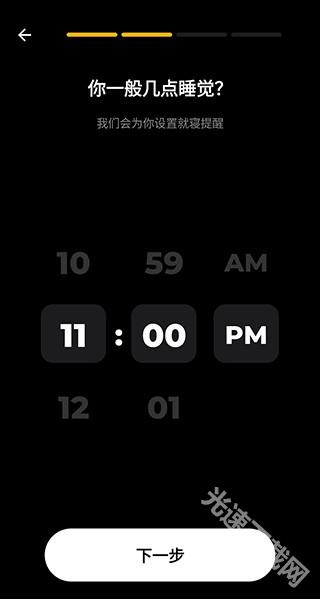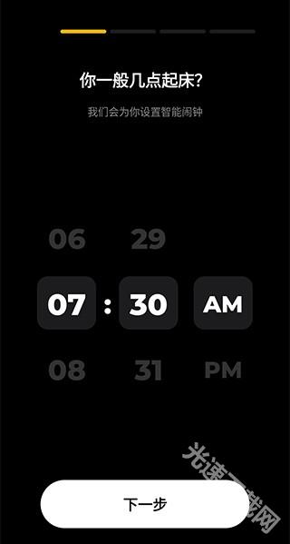 1、接着开启睡眠追踪功能,随后就会进入设置引导界面,第一步我们先设置好日常的起床时间,再点击下方的“下一步”按钮