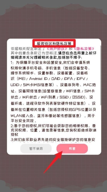 1、打开应用后,首先会弹出《服务协议和隐私政策》的提示窗口,请仔细阅读相关内容,确认无误后点击【同意】按钮即可进入应用。