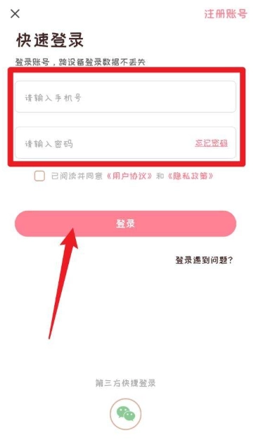 2、在快速登录页面填写手机号与密码,同时勾选同意《用户协议》和《隐私政策》,即可完成登录;也可选择第三方快捷登录方式。