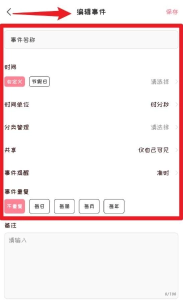 4、点击“新增事件”按钮后,能够对事件名称、时间、提醒方式、重复周期以及备注内容进行编辑,完成编辑并保存后,该纪念日就会被记录下来。