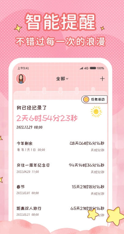 纪念日记录:把所有重要日期都记录下来,还有贴心的提醒功能,能保证你不会错过任何一个值得纪念的日子。