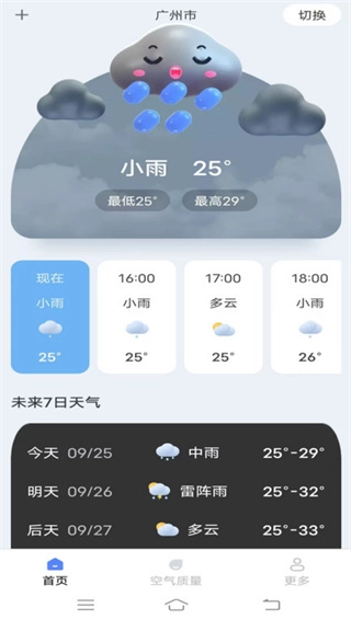 周周天气预报是一款十分实用的天气类应用。它能够实时展示当前的气温与天气状况,同时结合温度、湿度、风力、风向等多项气象要素,精准预测未来24小时的天气变化。此外,软件还具备空气质量监测功能,可实时更新PM2.5、花粉浓度等环境数据,并为易过敏人群提供针对性建议;更能依据当下天气,为用户推荐合适的生活活动。感兴趣的用户不妨体验一下!
