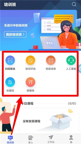 1.培训班页面配备了扫码报名、培训评价、班级消息等便捷功能,方便用户使用。