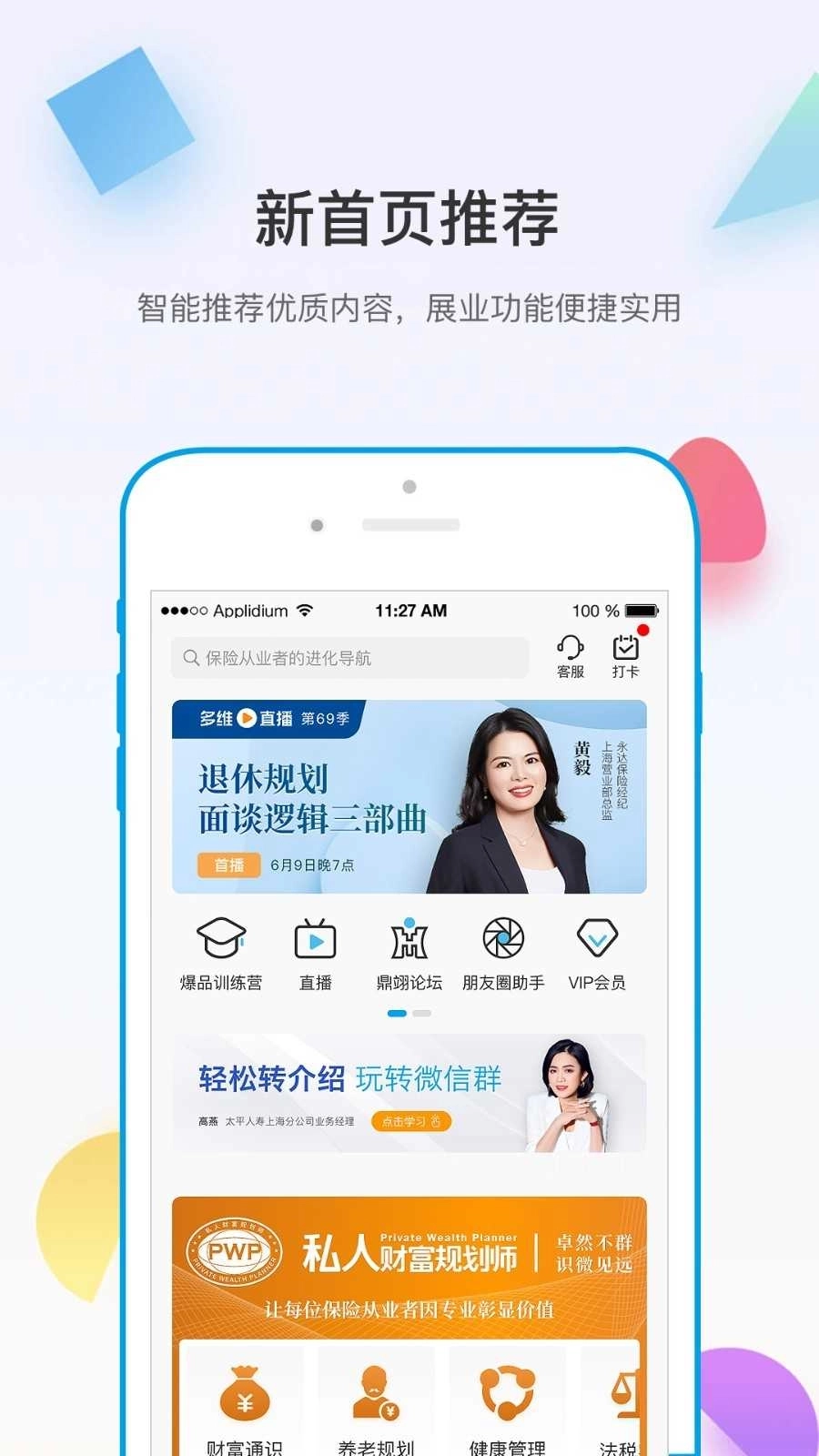 【展业工具】界面涵盖[营销海报][热读好文][直答签单][人脉圈]