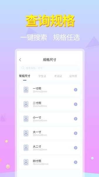 1、平台提供种类丰富的常用尺寸图标,主页展示了普通寸照、职业资格考试、学历考试等场景下的常用图标;
