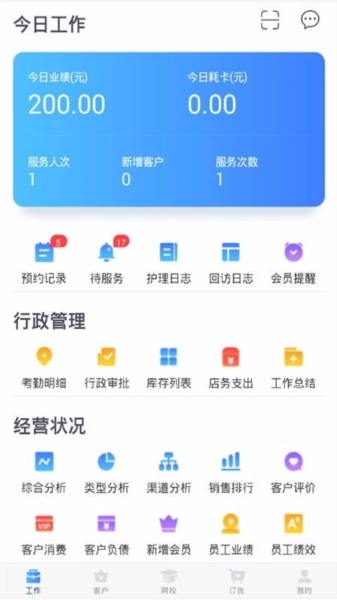 3、每日统计并展示当天的工作数据,包括今日业绩、今日耗卡、服务人次、新增客户等数据;