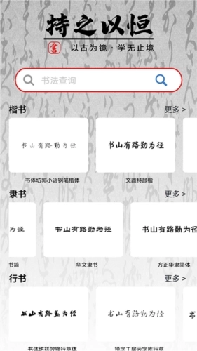 平台为用户提供的书法种类十分丰富,楷书、隶书、行书、小篆等各类书法字体的字帖内容,用户均可学习参考。