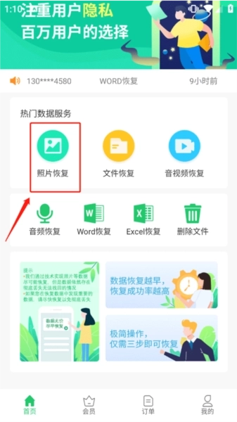 1、在手机上打开超级兔子数据恢复手机版,进入应用后选择你需要使用的服务,比如【照片恢复】。