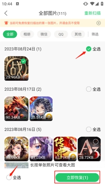 2、进入软件后,它会自动开始扫描照片;扫描完成后,选择你想要恢复的照片,接着点击右下角的【立即恢复】按钮即可。