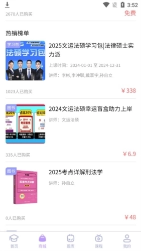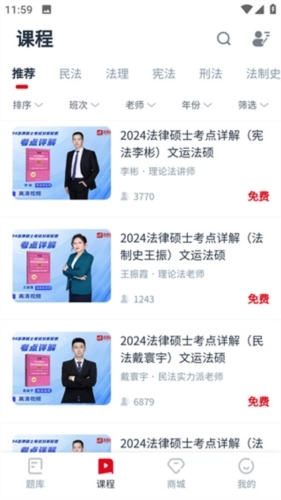 文运法硕支持通过手机端观看视频课程,而且应用内提供的所有学习资源均为免费。