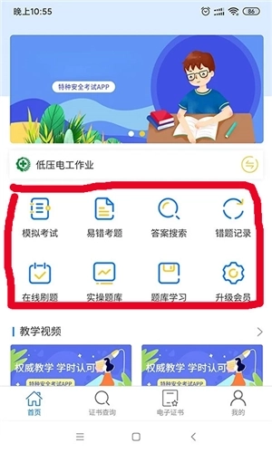 1、进入特种安全考试应用或页面后,可看到首页、证书查询、电子证书以及我的这几个版块;其中首页包含模拟考试、在线刷题、题库学习等功能模块。