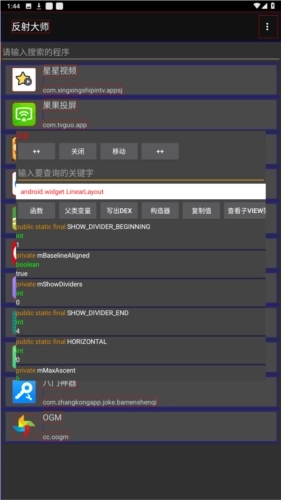 反射大师是一款功能丰富且实用的系统工具,多种实用功能,能为用户带来不少便利,支持直接对相关数据进行修改操作。作为适配各类安卓手机的自定义修改软件,其最新版本可轻松实现图片、文字等功能的拓展。使用时,只需选择需要脱壳的对象,开启悬浮框,就能调用可视化代码进行编译解析;面对多数套壳、加密的软件,也能通过简单的逆向编译完成解密脱壳操作。