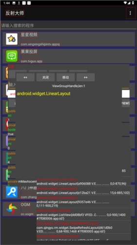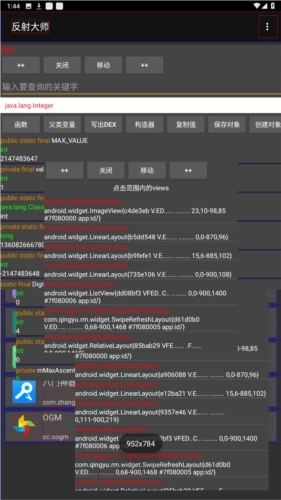 1、布局分析功能,可获取当前Activity中的所有View;点击屏幕任意位置,能获取点击范围内的全部对象——这里的“对象”指的是可调用其方法的View对象。