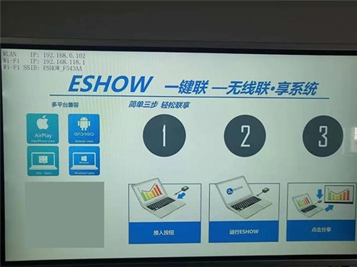 Windows电脑通常是把无线投屏器的USB按键当作发送端,插入并按下就能一键投影。在特殊情形下,则必须使用eshow无线投屏,由于台式电脑无法直接连接WIFI,所以要给无线投屏器连接网线,之后启动即可。