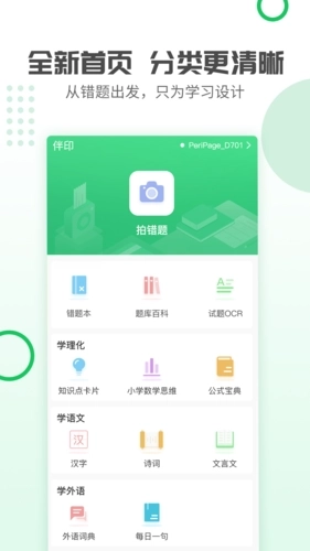 【配套硬件】可连接口袋打印机,机身小巧迷你,让人爱不释手,方便随时随地打印错题。