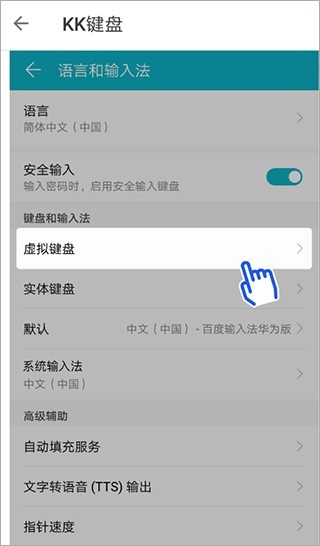 3、另外,大家也可以进入手机的设置界面,找到“语言和输入法”选项,然后在“虚拟键盘”的设置项中将KK键盘设为默认输入法。
