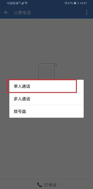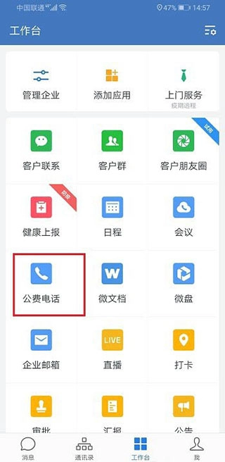 2、接下来我们尝试使用公费电话功能,具体操作是打开企业微信,点击“公费电话”选项,然后选择“打电话”,操作步骤可参考下图: