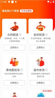 京东外卖提供多种骑手类型选择,有意向的用户可根据不同类型申请加入,进而获取对应类型的订单,助力大家全年稳定增收。
