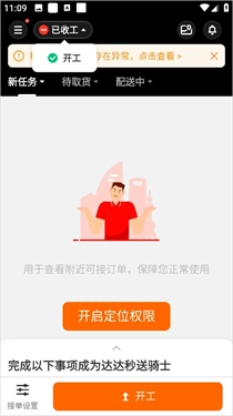 3、注册成功后点击上方开工就可以开始接单了。