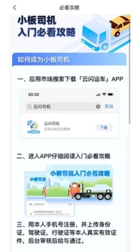 云闪司机平台配备了一键接单的快速匹配功能,同时还准备了新手入门的必备指南,助力司机伙伴拓展人脉、结伴协作。用户借助平台能够高效处理订单、提升工作效率并增加收入,进而更便捷地利用物流配送服务。无论用户需要返程配货还是往返运输,云闪司机都能精准满足需求,让货运任务处理更顺畅、收益获取更轻松。若您希望体验高效的货源匹配、享受优质服务,或是学习成为小型货车司机的相关技能,不妨试试云闪司机平台,它能让您随时获取货运相关技巧,顺利完成货物配载与返程接单。