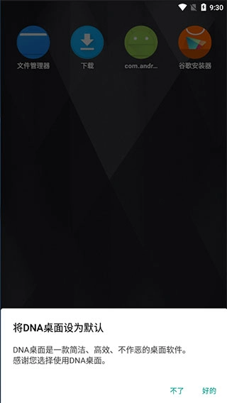 1、第一步是安装,点击进入后能把手机的默认桌面设置成dna桌面;