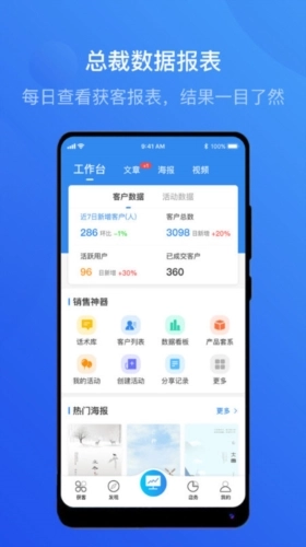 【总裁数据看板】总裁每日可便捷查看获客报表与朋友圈发布数据,各项结果清晰直观,一目了然!