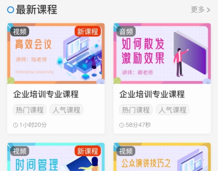 员工使用个人账户登录系统后,可在“我的学习”页面查看已分配的学习任务。任务卡片会展示课程名称、授课讲师、剩余学习时长、任务完成进度等实时更新的信息数据。