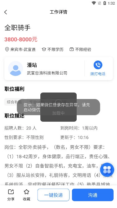 4、点击感兴趣的岗位进入详情页,查看岗位描述、企业介绍及福利待遇,若有意向可点击“立即投递”,选择简历完成投递操作。