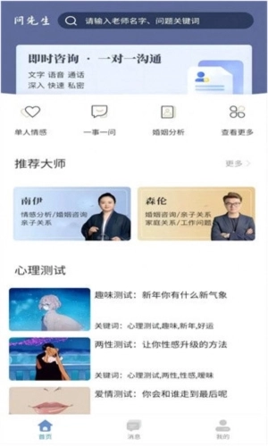问先生健康咨询是一款功能强大的在线心理健康咨询服务软件。用户可以与专业心理医生、临床心理学家和咨询师进行交流,并获得他们的意见和建议。平台提供老师一对一亲自指导,针对具体问题逐一详细解析,为您提供贴心服务。入驻的都是非常专业的心理咨询师,会根据用户的不同情况给出合理建议,帮助您不断调整心态,积极面对生活。有需要的朋友快来试试吧!