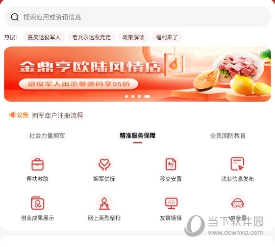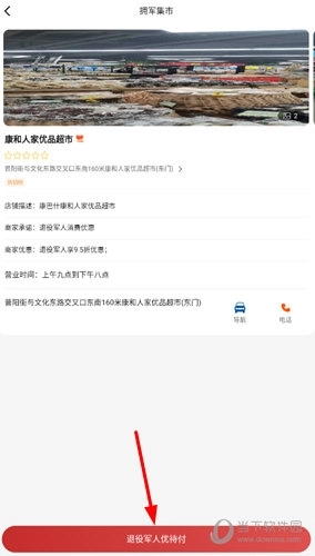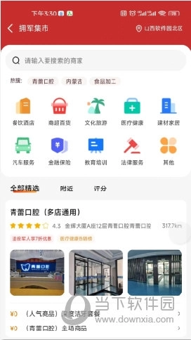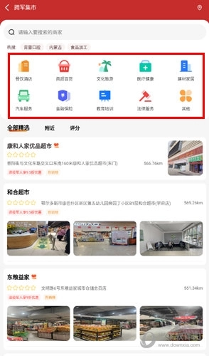 三、点击【拥军集市】后,就能看到周边提供军人优惠的各类商铺,点击对应模块即可快速进入相关页面。