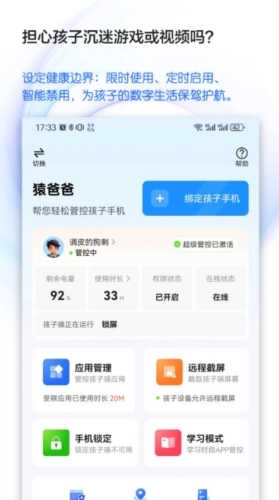 在快节奏的现代生活里,怎样合理规划孩子的屏幕时间,成了不少家庭要应对的一大难题。猿爸爸上网守护正是针对这个问题设计的,它借助一系列智能管理工具,帮助家长们更有效地平衡孩子娱乐与学习的时间分配。这款产品支持绑定孩子的手机,让家长能随时了解孩子手机的电量情况、使用时长,甚至可以远程锁定孩子的设备,从而保证孩子有足够的时间专心投入学习或参与其他有益的活动。另外,家长还能够对孩子可以使用的应用列表进行管理,防止孩子接触到不合适的内容。