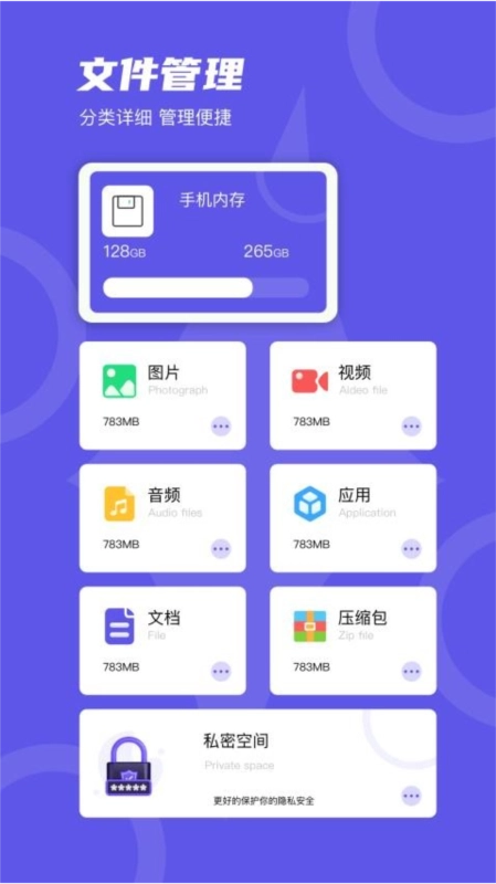 手机的存储空间里对所有文件做了详细分类,这样查询文件就更简单了。
