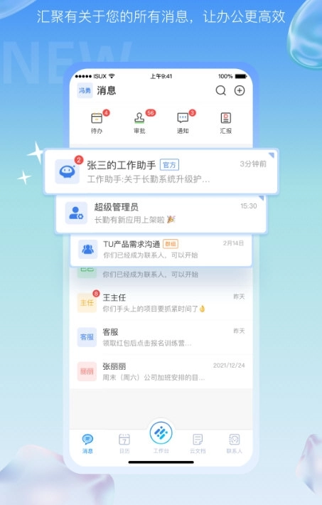 汇报、审批、群组及工作通知等各类消息均可在消息页查看办理,随时随地实现零距离沟通