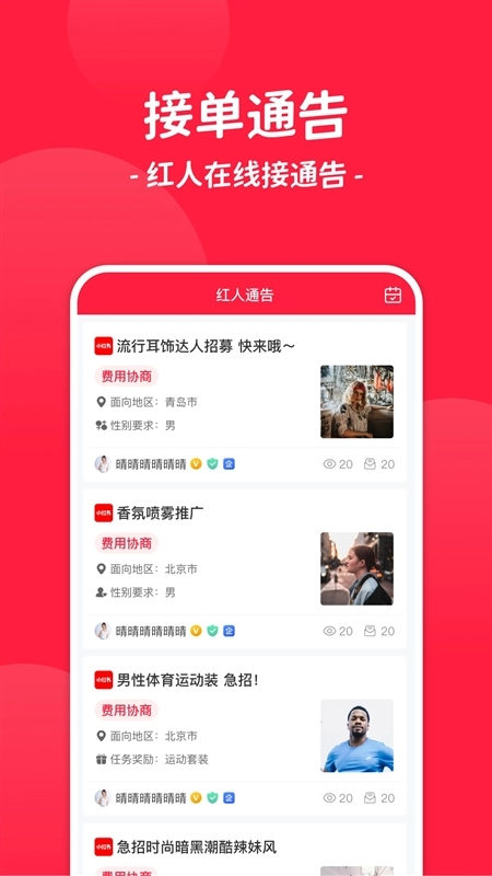 1、接单通告:红人在线接通告