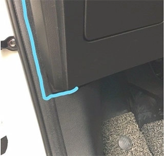 走线2——仪表台左侧,最左边的盖板轻轻卡住了密封条,不过不用担心,用撬棒从上下两端就能把密封条掀起,继续塞线后复原就行。最下方蓝线拐弯处,线能完全藏在装饰板内部,不会裸露。往密封条里塞线、压线时,尽量把线塞到最深处,那里刚好有缝隙可以藏线。